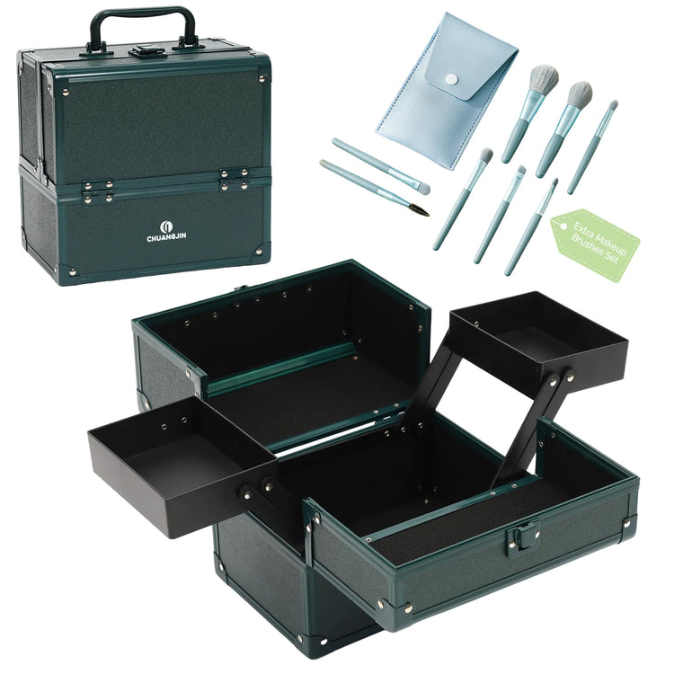 CHUANGJIN Makeup Train Case 2 Trays Makeup Box Organizer Portable Travel Makeup Case Lockable Makeup Storage Organizer Cosmetic Box for Jewelry Nail Tech Brushes Accessories ToolGreen Pro